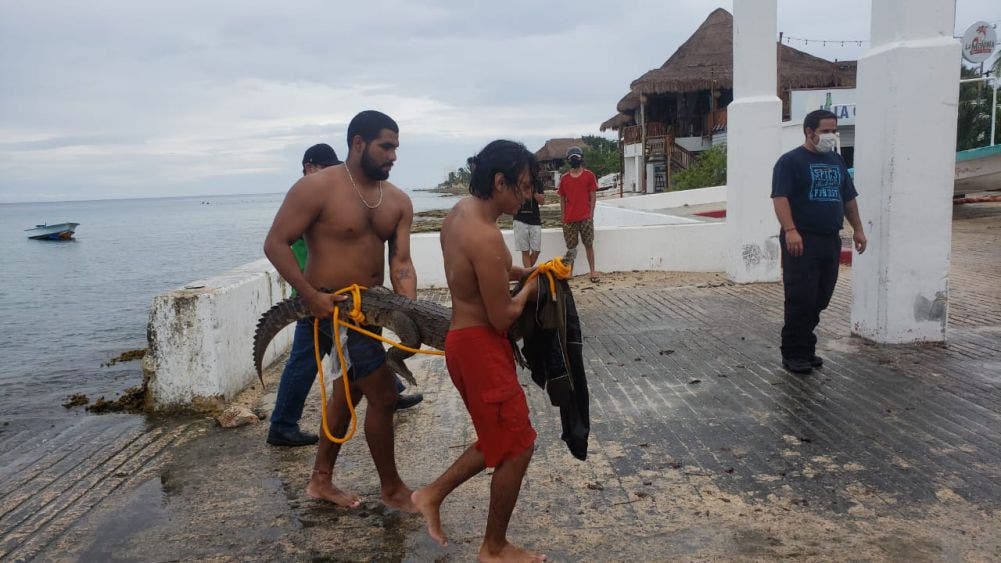 Guardavidas de Protección Civil de Cozumel, con apoyo de pescadores y elementos del Ejército Mexicano con una moto acuáticam, lograron capturar un cocodrilo de...