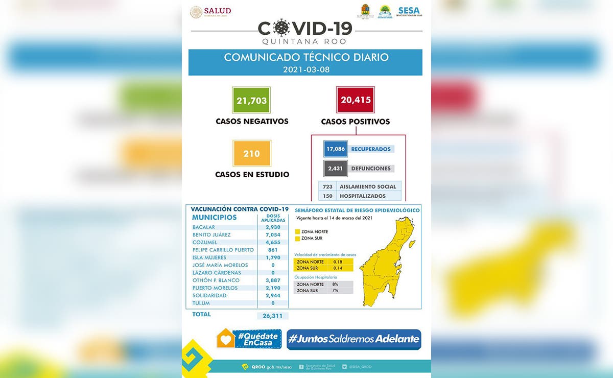 Continúa el descenso de contagios por covid-19, en Quintana Roo, sin embargo, las defunciones se mantienen sin cambios, según el último informe técnico de...