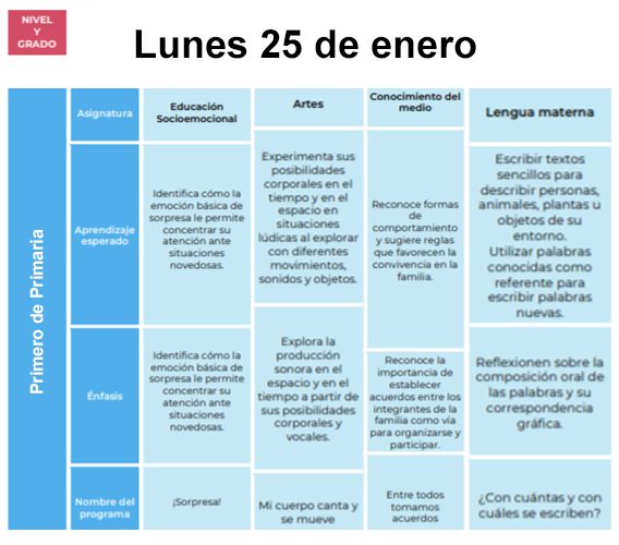 Las clases que tocarán el próximo lunes 25 de enero para los estudiantes de Primero de Primaria y que cursan el sistema Aprende en Casa, son las siguientes: