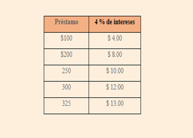 Aquí una tabla con el ejemplo, que muestra lo que se debe pagar por un interés del 4%, por cada $100.00 de préstamo
