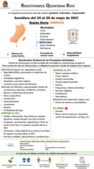 Continuará Quintana Roo en Semáforo Naranja hasta fin de mes, cuando todo mundo esperaba que hoy entrara en vigor el temido Semáforo Rojo en la entidad, la autoridad estatal ha decidido prolongar todo mayo la permanencia de la alerta naranja.