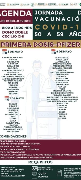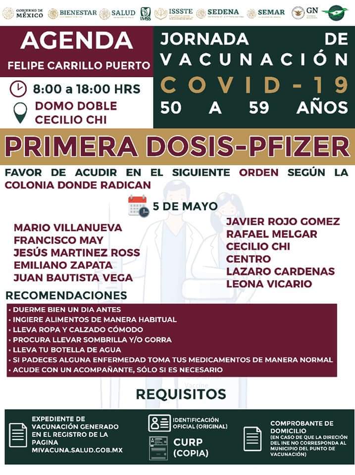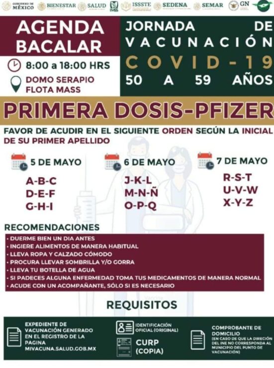 Hoy miércoles inicia la aplicación de la primera dosis de la vacuna contra el Covid-19, a adultos de 50 a 59 años del municipio de Bacalar.