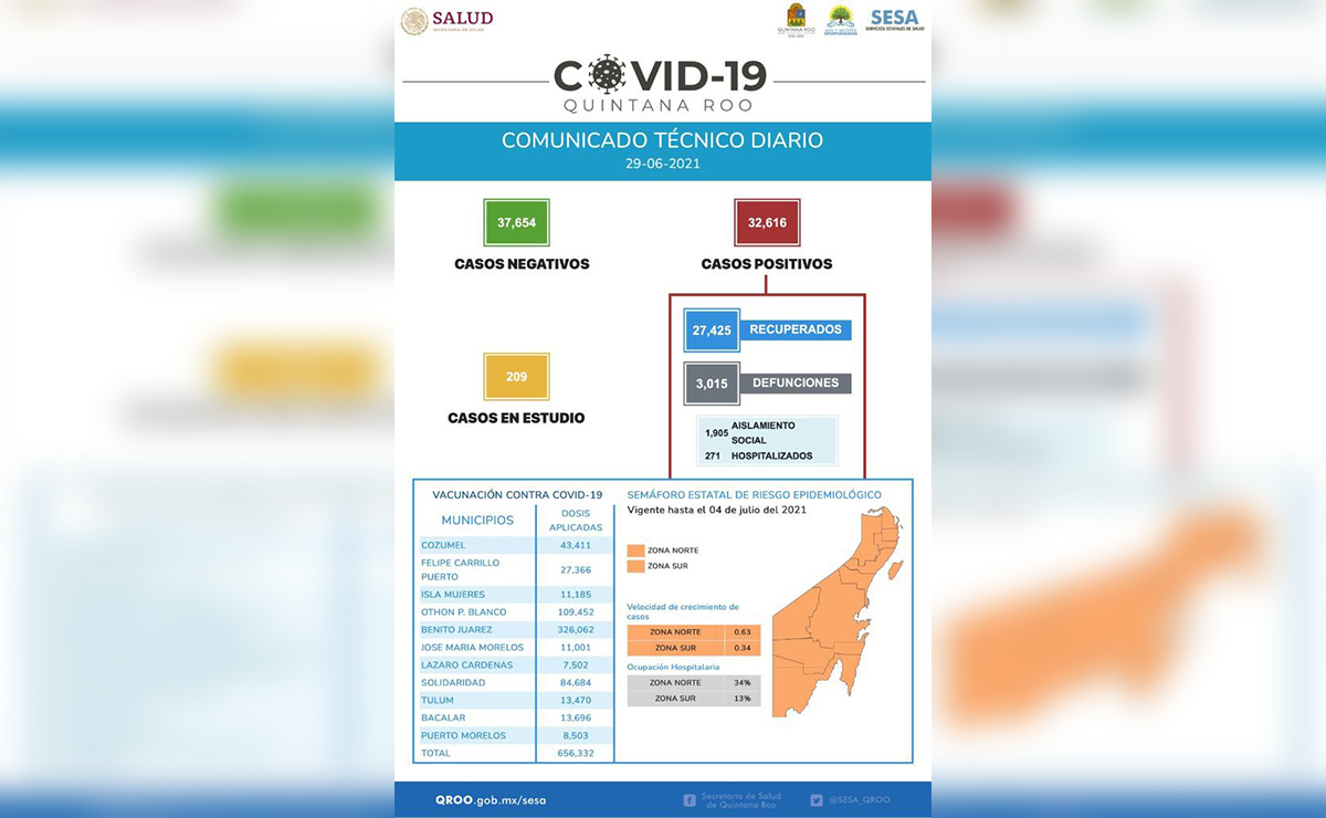 También se informa, que dentro de los esfuerzos de contención de la pandemia, se han aplicado hasta el momento un total de 656 mil 332 dosis de la vacuna contra el covid-19 en el estado de Quintana Roo.