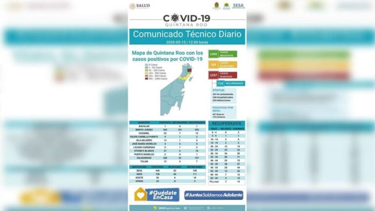 Quintana Roo ya acumula mil 257 casos positivos de COVID 19, así como 234 defunciones, siendo 39 contagios nuevos y 7 muertes por esta causa los reportados al corte de este 15 de mayo, según cifras oficiales de la Secretaría de Salud, quien informó que los 7 decesos se dieron en el municipio de Benito Juárez, el cual ya acumula 929 confirmados, 181 decesos y 555 recuperados haciendo un total de 193 casos activos.