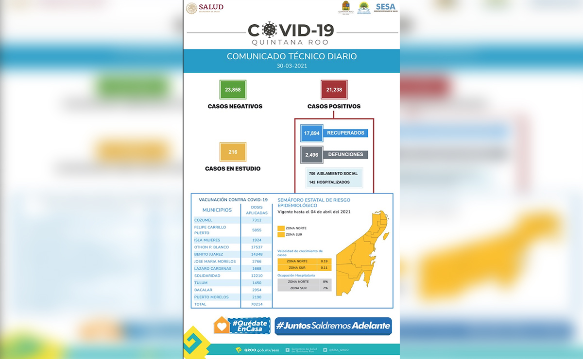 Y es que, son 55 casos positivos de COVID 19, así como 4 defunciones más por esta causa al corte del 30 de marzo en Quintana Roo, lo que hace un acumulado de 21 mil 238 positivos, 17 mil 894 recuperados y 2 mil 496 defunciones en lo que va de la contingencia sanitaria en la entidad.