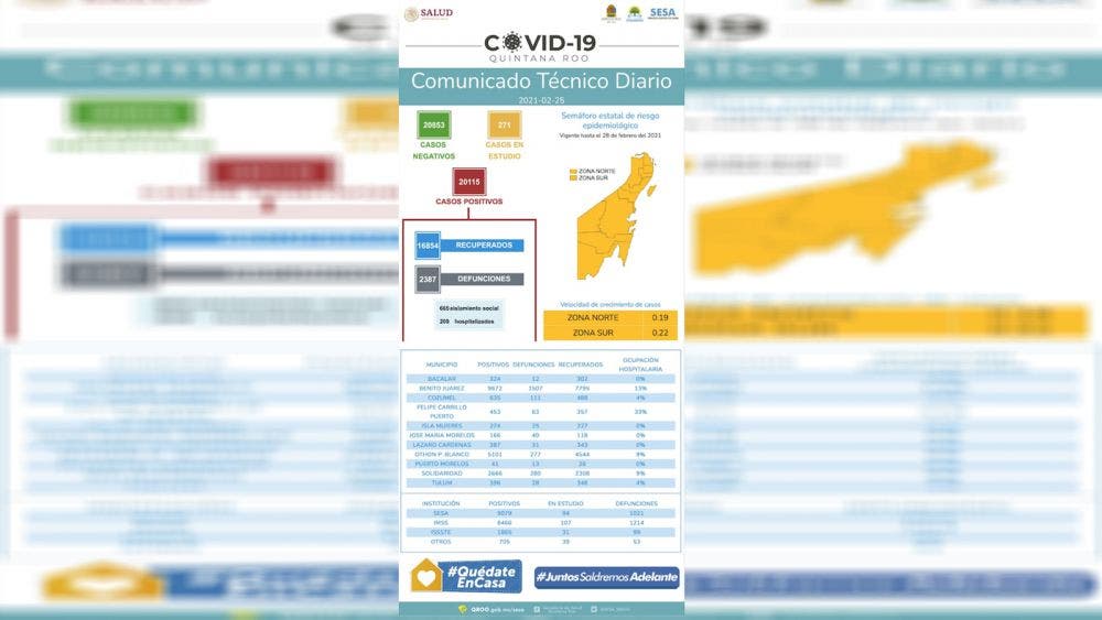 Quintana Roo reporta 62 casos nuevos de contagios por covid-19, así como siete defunciones más por esta causa al corte del 25 de febrero, según los datos de la Secretaría de Salud, con lo cual acumula 20 mil 115 confirmados, 16 mil 854 recuperados, y 2 mil 387 defunciones en lo que va de la contingencia sanitaria en la entidad.