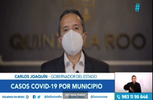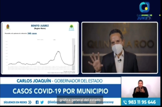 En este mismo espacio televisivo, que también se difunde a través de las redes sociales, el mandatario estatal enumeró la cantidad de nuevos contagios por municipio en ese momento, siendo Benito Juárez y Solidaridad los que mas han aumentado sus números.