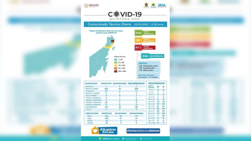 Por municipios los casos se distribuyen de la siguiente manera; Benito Juárez con 688 positivos, 83 defunciones y 339 recuperados; Solidaridad con 148 positivos, 22 defunciones y 68 recuperados; en Cozumel 23 contagiados, 6 defunciones y 11 recuperados.