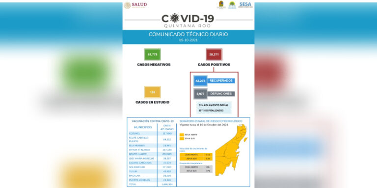 A la baja las cifras de Covid-19 en Quintana Roo; al corte del 5 de octubre reportó 58 casos nuevos así como 3 defunciones más por esta causa.