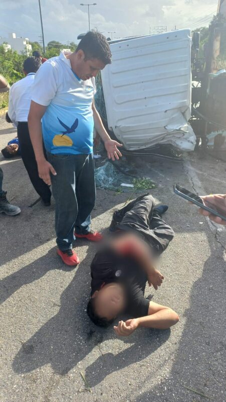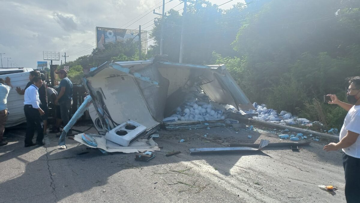 Por lo menos dos sujetos resultaron lesionados de gravedad, al volcar el camión de carga en el que se trasladaban y salir expulsados presumiblemente por el parabrisas de la unidad, el accidente ocurrió sobre el tramo Cancún-Puerto Morelos.