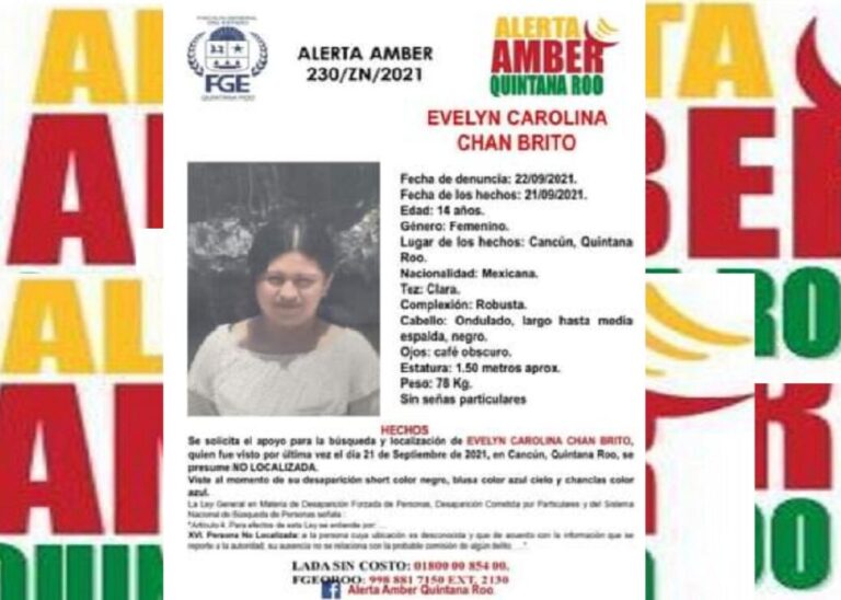 La Fiscalía General de Justicia del Estado de Quintana Roo (FGE) activó la Alerta Amber para localizar a la jovencita Evelyn Carolina Chan Brito, de 14 años de edad, quien fue vista por última vez el pasado día 21 de septiembre del presente año en la ciudad de Cancún, se presume no localizada.