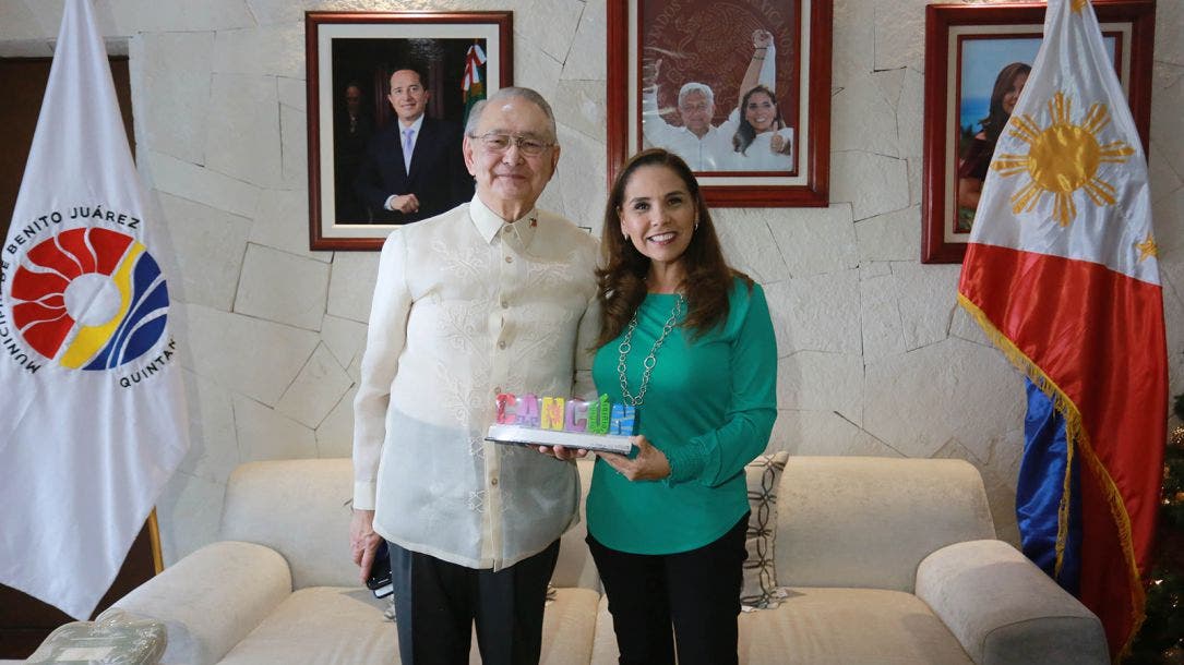 Afianza Mara Vínculos con las Filipinas.- La Presidente Municipal, Mara Lezama, recibió la visita del Excelentísimo Señor Demetrio Tuason Remedios, Embajador de Filipinas en México, con quien dialogó sobre diversos temas de importancia común entre los que destacan la posibilidad de llevar a cabo un hermanamiento entre una de las ciudades de ese país con nuestro municipio, así como respaldar las gestiones que permitan estrechar las relaciones entre Cancún y esa nación.