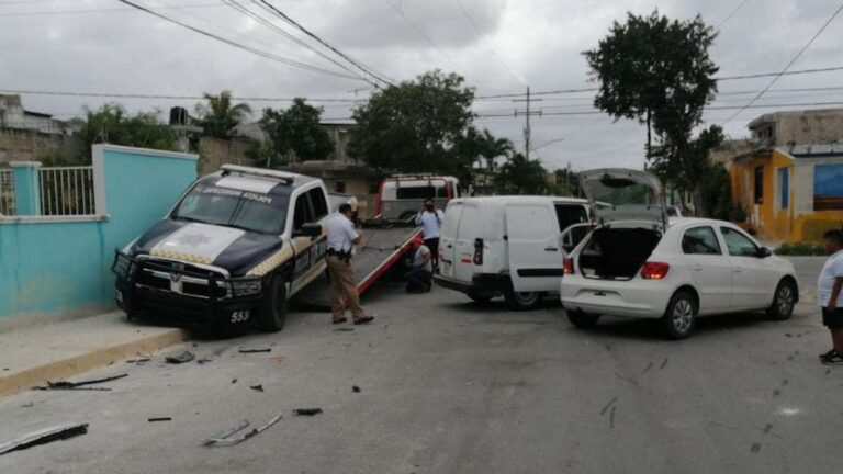 Agentes de tránsito chocan con particular en la SM 220.- Fuerte accidente se registró esta tarde en las inmediaciones de la Supermanzana 220, entre una unidad de la dirección de Tránsito Municipal y un automóvil particular, en el cual no hubo personas lesionadas.