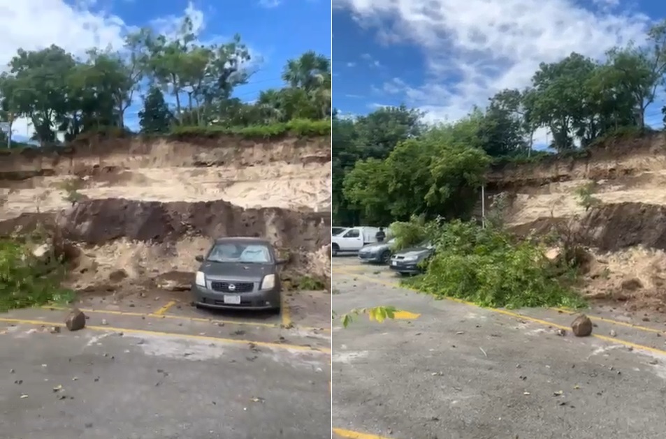 Varios metros de terreno se deslavaron en un área colindante con el estacionamiento del CRIT, lo que dejó afortunadamente solo daños materiales.