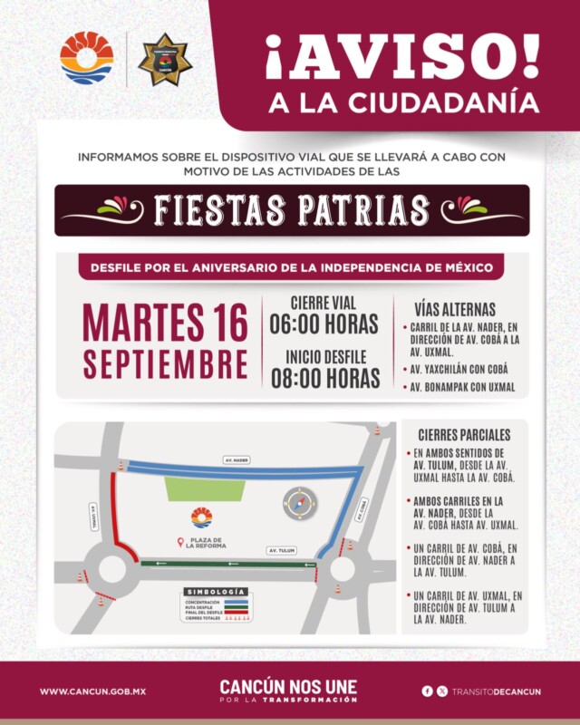 Cancún, Quintana Roo.- La Secretaría Municipal de Seguridad Ciudadana y Tránsito (SMSCyT) de Benito Juárez, dio a conocer el Plan Operativo Vial con motivo de las Fiestas Patrias, con el objetivo de garantizar la seguridad vial de peatones, conductores y asistentes a los eventos conmemorativos.