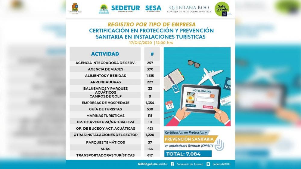 Luego de extender hasta el 31 de enero la vigencia de la Certificación en Protección y Prevención Sanitaria en Instalaciones Turísticas (CPPSIT), la Secretaría Estatal de Turismo (Sedetur) alista la convocatoria para aplicar la recertificación a siete mil 84 empresas turísticas registradas en Quintana Roo.