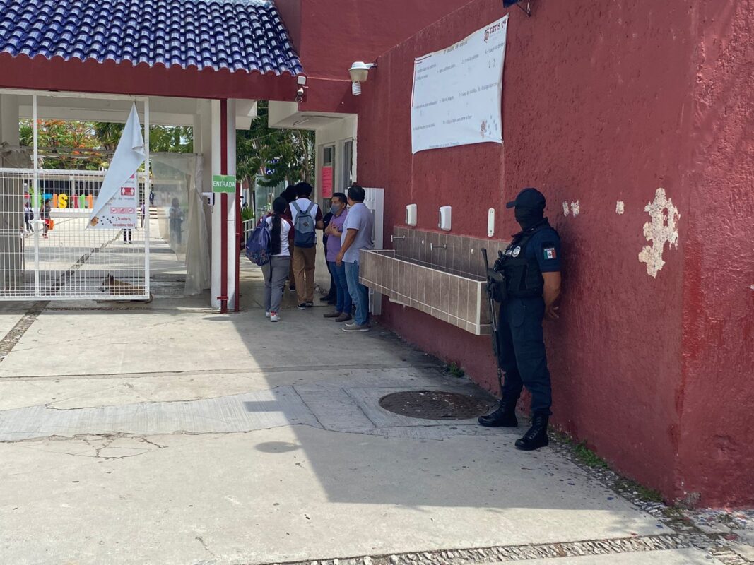 Personal de la Policía Quintana Roo y de la Secretaría de la Defensa Nacional (Sedena), acudieron a esta institución educativa para hacer presencia, ya que el día de ayer alumnos de este lugar reportaron el hallazgo de un mensaje en una puerta de los baños, que advertía que no acudieran a clases pues habría una balacera.