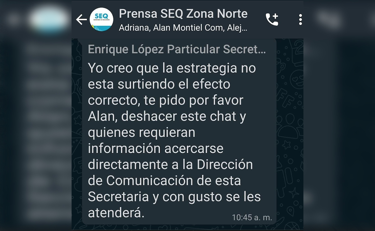 Amenaza SEQ con disolver vía de comunicación con la prensa, Enrique López, secretario particular de la titular de la Secretaría de Educación en Quintana Roo (SEQ) Ana Isabel Vázquez Jiménez, amenaza a la prensa con cerrar chat de difusión, al sentirse incómodo por la presión de la prensa, al solicitar información de interés.