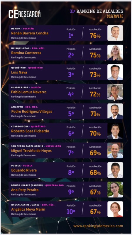 En este 31 ranking, el más reciente, contempla en total a los alcaldes de las 58 ciudades más importantes de México, basado en el promedio que arrojan las calificaciones de los ciudadanos hacia su trabajo en materia de recolección de residuos sólidos, alumbrado público, mantenimiento de áreas públicas, bacheo y atracción de inversiones.