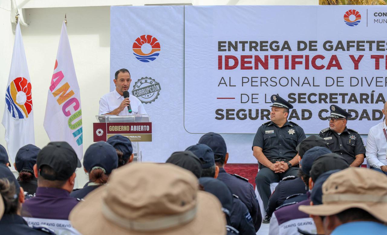 Cancún, Q. R., a 28 de febrero de 2026.- En el marco del cierre de la primera etapa a la cruzada “Cero Corrupción” que integra el programa “Identifica y Transforma”, impulsada por la Presidenta Municipal, Ana Paty Peralta, se entregaron 56 gafetes a elementos de la Secretaría Municipal de Seguridad Ciudadana y Tránsito, alcanzando en total 246 en dicha corporación y más de mil en todo el Ayuntamiento, como parte de las acciones de recuperación de la confianza en los servidores públicos y compromiso en la construcción de la paz.