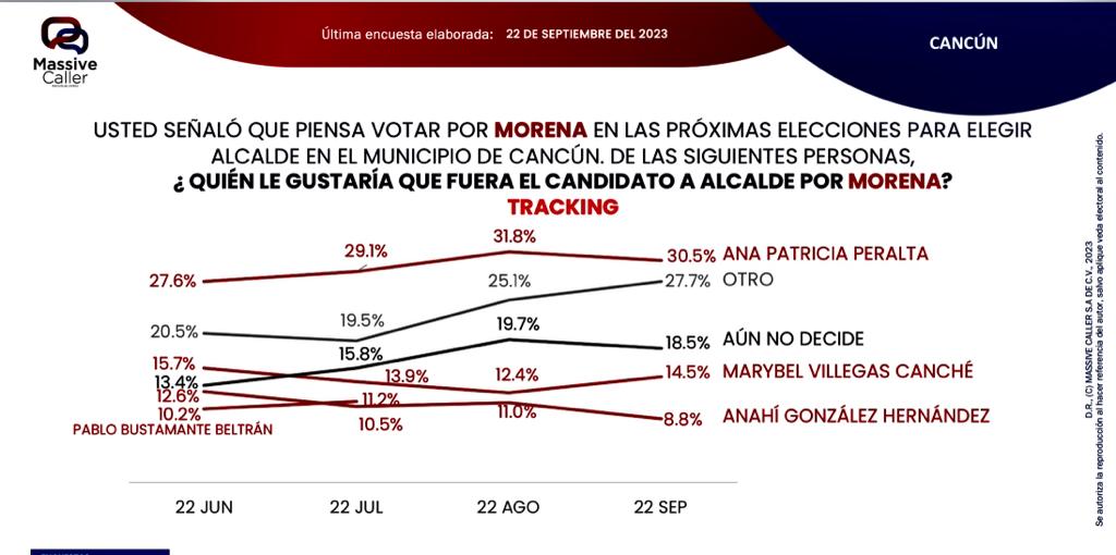 Al preguntar “¿Quién le gustaría que fuera el candidato o alcalde por Morena?”, el 30.5% de los encuestados favorecieron a Ana Paty Peralta, mientras que sólo 14.5% votarían por Marybel Villegas Canché y 8.8% por Anahí González Hernández. Lo que representa dos a uno y tres a dos sobre las siguientes figuras morenistas en la encuesta para la actual presidenta municipal de Cancún. Del resto de las 600 personas participantes en el ejercicio estadístico, 27.7% escogería a otro candidato y 18.5% aún no decide.