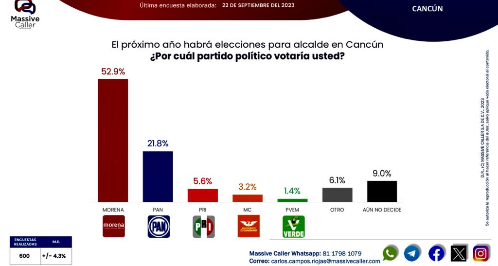En los resultados publicados este 23 de septiembre, la encuestadora dio a conocer que en Cancún el 52.9% de los electores votarían por Morena, mientras que el 21.8% elegiría al Partido Acción Nacional (PAN), 5.6% al Partido Revolucionario Institucional (PRI), 3.2% a Movimiento Ciudadano y 1.4% al Partido Verde Ecologista; además, 6.1% de los ciudadanos elegirían otro partido y 9% aún no decide.