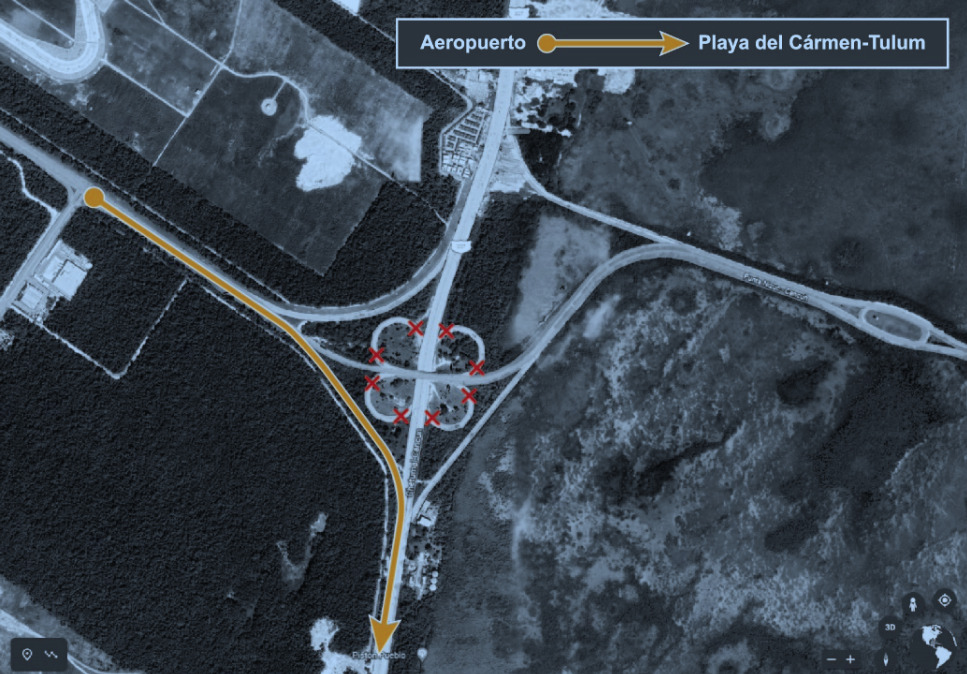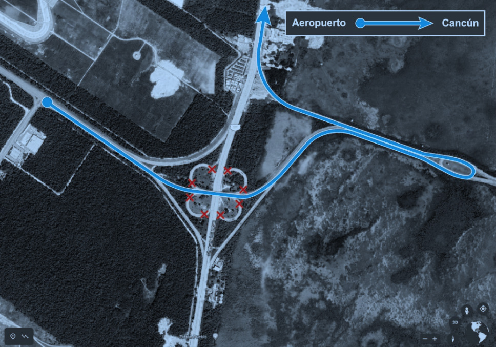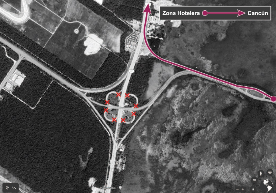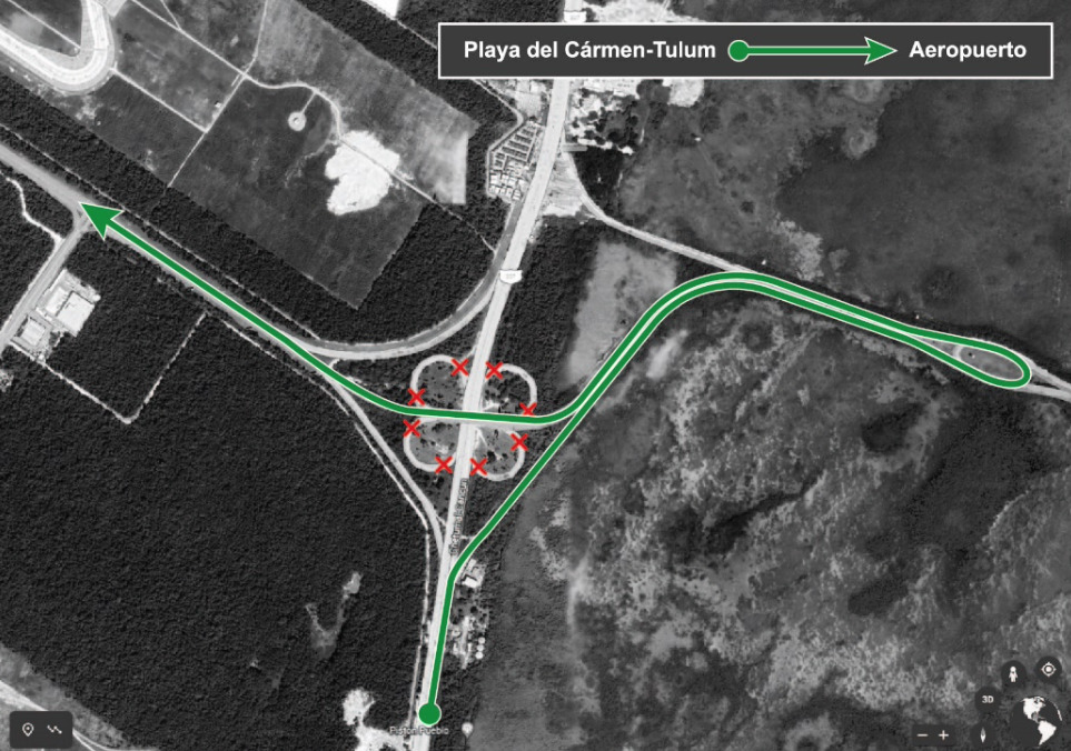 1.- Posible retorno en “U” en el distribuidor vial de la carretera o libramiento a Mérida con Boulevard Colosio para regresar ya sea a la ciudad de Cancun o hacia la Zona Hotelera en circulación norte – sur.