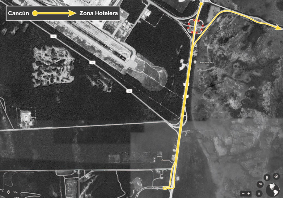 1.- Para vehículos saliendo del aeropuerto hacia la ciudad de Cancun circular tomando el puente actual, ir en dirección a la Zona Hotelera y en glorieta de FONATUR retornar para tomar la desviación a la gasolinera e incorporarse detrás de ella en el boulevard Colosio. (Se tratara que esta última vialidad atrás de la gasolinera sea de 2 carriles).