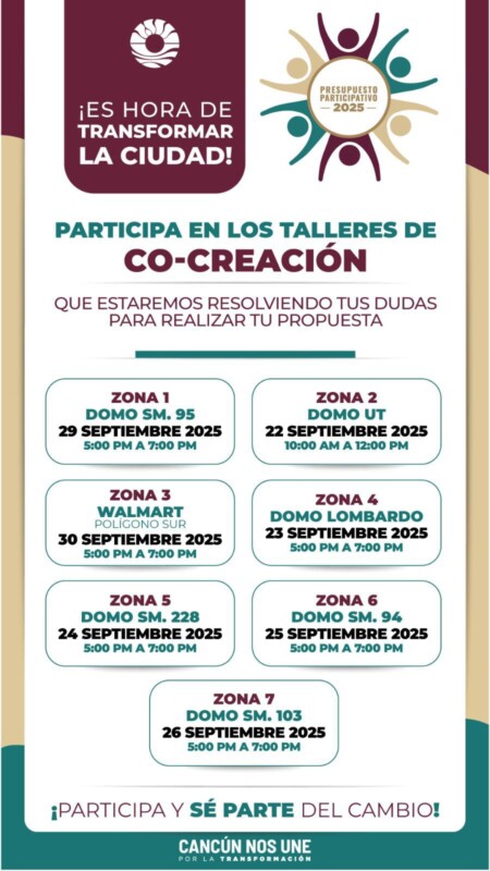 Cancún.- La Secretaría Municipal de Bienestar anunció la convocatoria para participar en los Talleres de Co-creación de las zonas 1, 2, 3, 4, 5, 6 y 7 del “Presupuesto Participativo 2025”, que se realizará del 22 al 30 de septiembre, con el firme compromiso de transformar Cancún en una ciudad más próspera y con mejor calidad de vida para la población.