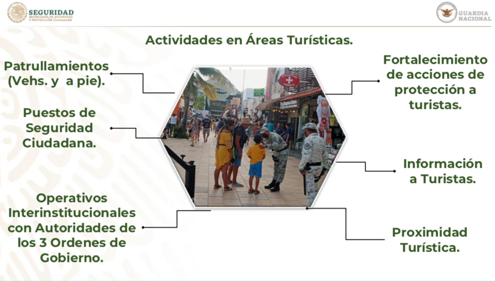 Dentro de sus propios despliegues, la Guardia Nacional ha realizado diversas actividades de proximidad turística con el fin de recuperar la seguridad en estas zonas, en las cuales se han realizado numerosos patrullajes en vehículos y a pie, así como instalado puestos de Seguridad ciudadana.