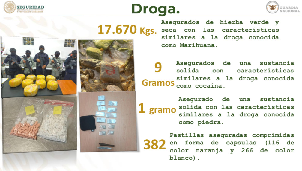 A este respecto, la dependencia federal indica que se decomisaron un total de 17.670 kilogramos de la droga denominada mariguana, nueve gramos de una sustancia con las características de la cocaína, un gramo de la droga conocida como piedra, y 382 pastillas psicotrópicas.