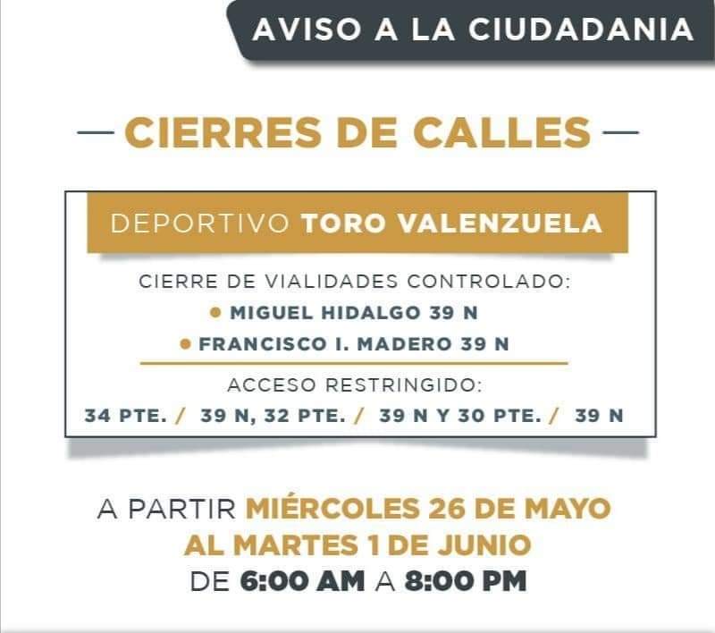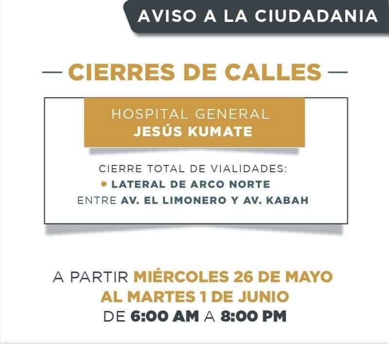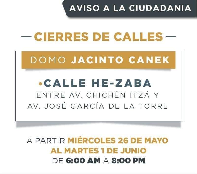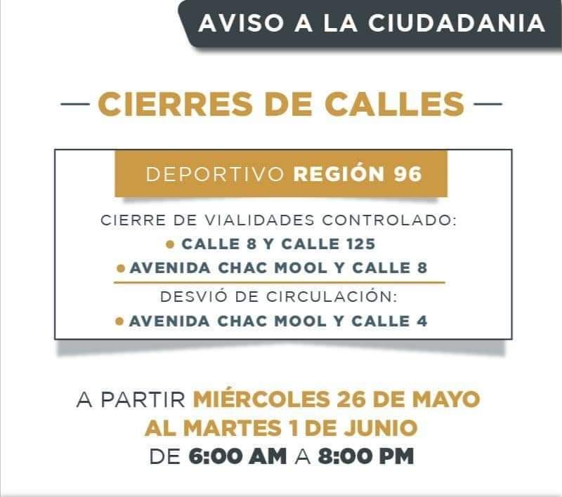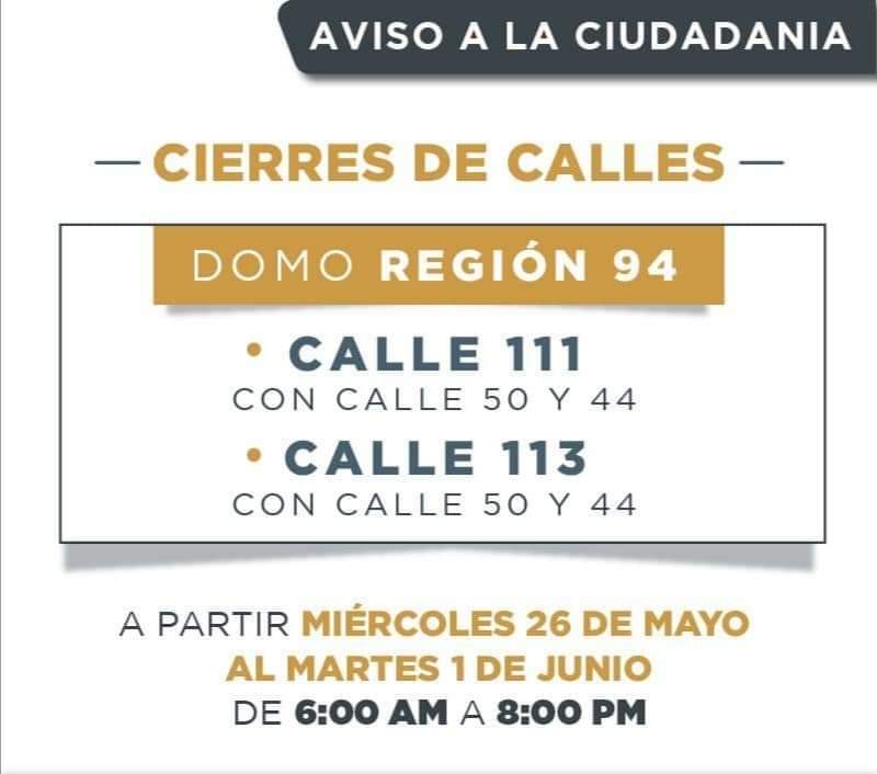 Es así, que la Dirección de Tránsito Municipal del H.Ayuntamiento de Benito Juárez, emitió un aviso a la ciudadanía donde informa que «Se realizan los siguientes “Cierres de calles, el miércoles 26 de mayo al Martes 1 de junio de 6:00 am a 8:00 pm.»