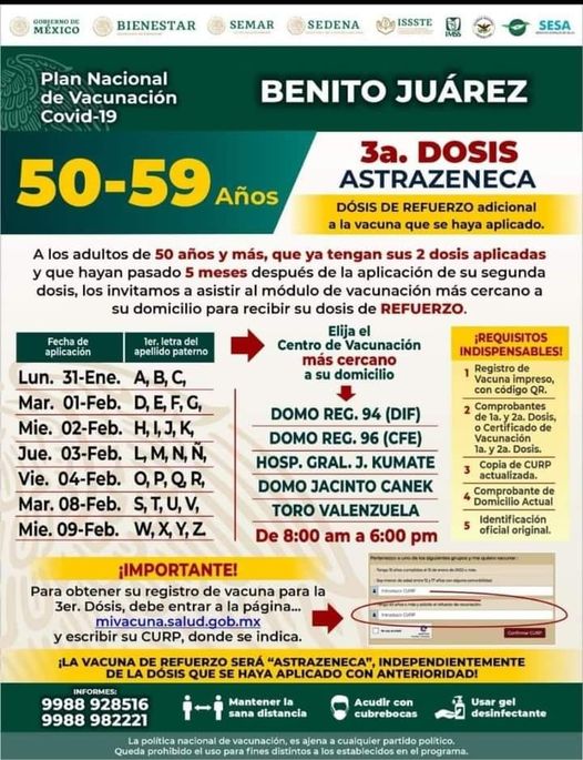 Con la finalidad de reforzar la vacunación contra el virus del covid-19, la Secretaría de Salud (Sesa) informó hoy que realizará en Cancún una jornada de aplicación de la tercera dosis de refuerzo para adultos de 50 a 59 años.