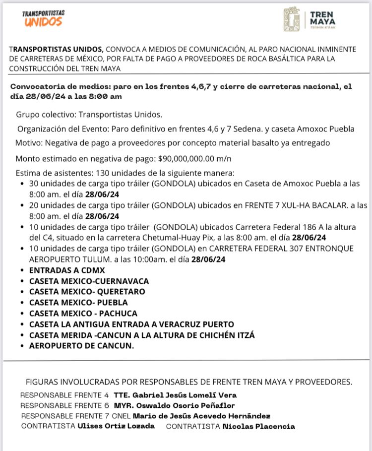 En un comunicado difundido hoy, los transportistas expresaron su inconformidad por la falta de pago a proveedores de roca basáltica utilizada en la construcción del Tren Maya, material que ya fue entregado pero no remunerado.