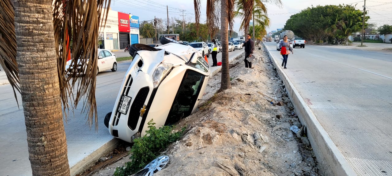 Un aparatoso accidente vial se registró la mañana de este martes en el bulevar Luis Donaldo Colosio de Cancún, donde un automóvil terminó volcado sobre el camellón.