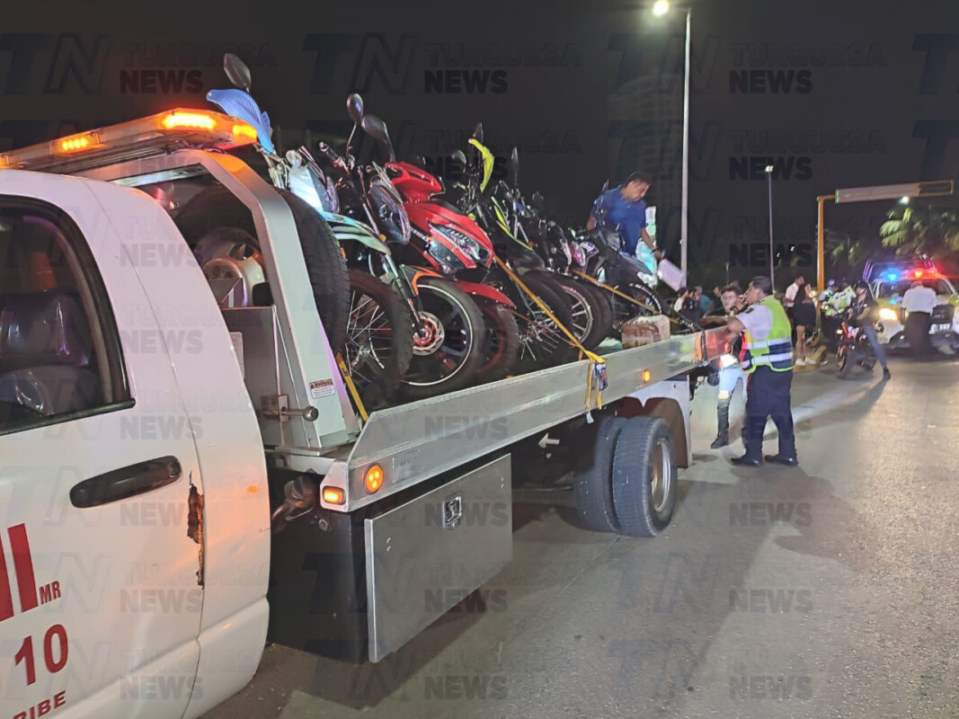 Cancún.- Más de 30 motocicletas de diversos modelos fueron aseguradas por las autoridades de Tránsito y Policía, durante un operativo la noche de ayer afuera de la Plaza de Toros, por no tener documentos en regla y algunas con reporte de robo.