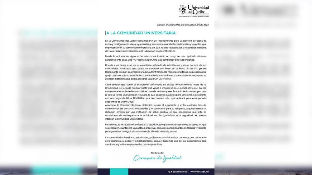 Al respecto la casa de estudios emitió un comunicado, donde señala que la queja fue atendida en su momento, y que como el alumno sancionado ya estaba temporalmente de baja y fuera de la universidad no se le pudo notificar que su baja sería definitiva, hasta que intentó reinscribirse, al actual semestre, donde pidió un recurso de revisión que el mismo procedimiento contempla, y donde se le encontró causales para sancionar al estudiante con una segunda baja temporal por seis meses más, que aplicará para el periodo otoño 2020, aunque alumnas señalan en redes que continua tomando clases de manera virtual.