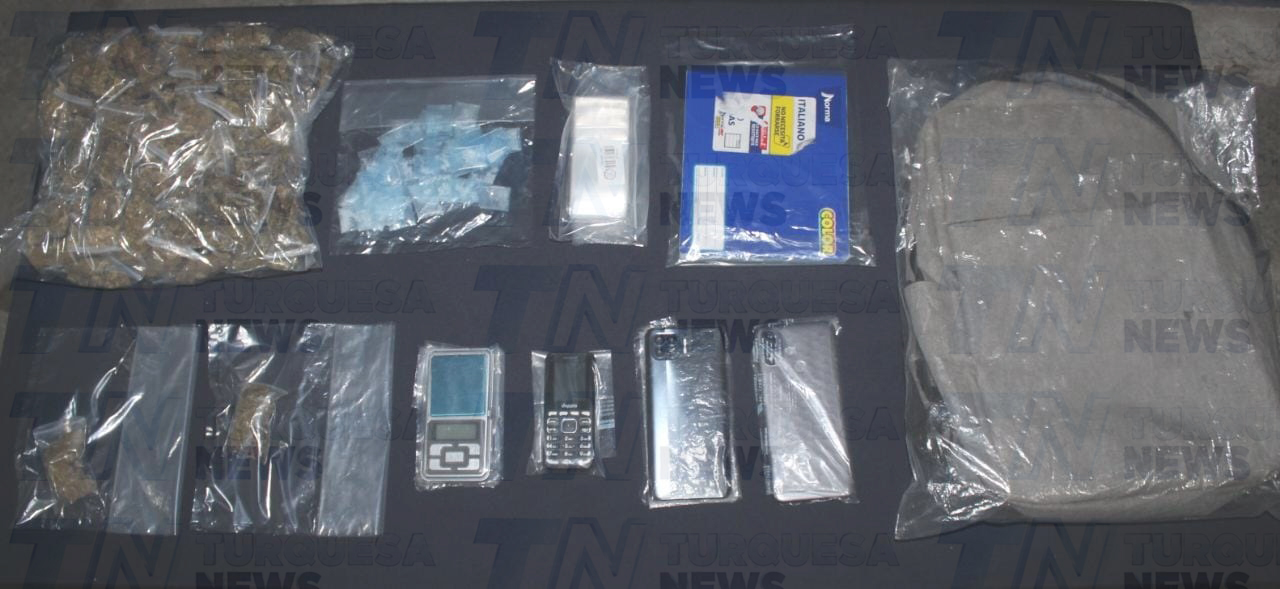 Posteriormente se les solicitó a las tres personas una inspección física y se les decomisó 95 bolsitas transparentes con vegetal verde similares a las características de la marihuana, 36 bolsitas transparentes que en su interior contenía fragmentos sólidos con las características de la droga conocida como cristal, tres celulares, una báscula gramera, una libreta azul con apuntes, un paquete de bolsitas transparentes tipo ziploc y un lapicero.