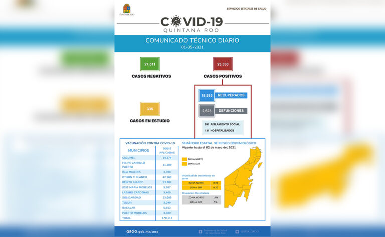 Aumenta mortalidad por covid-19 en Quintana Roo, según el reporte de la Secretaría de Salud (Sesa) en la entidad, hoy se agregaron 11 nuevas defunciones a la lista de víctimas por el virus pandémico, acumulando ya 2 mil 623.