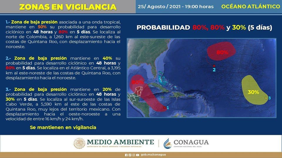 La primera de estas zonas se ubica en el Atlántico central a 3,195 km al este-noreste de costas quintanarroenses, y mantiene en 40 por ciento, su probabilidad para desarrollo ciclónico en 48 horas y 80 por ciento en 5 días.