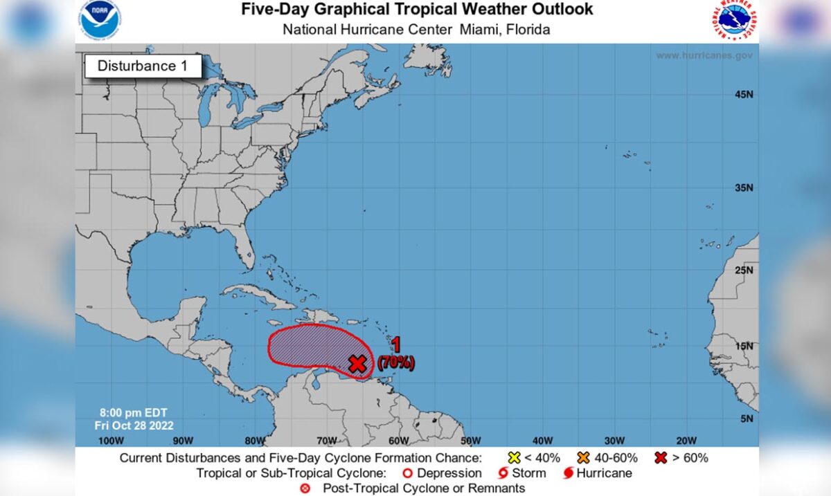 Que en esa fecha ubicaban al fenómeno con apenas un veinte (20) por ciento de probabilidades de desarrollo, pero en su reporte de las 20:00 horas (ocho de la noche) de este viernes 28 de octubre, el Centro Nacional de Huracanes de Miami Florida elevó su nivel de probabilidades hasta un 70 por ciento.