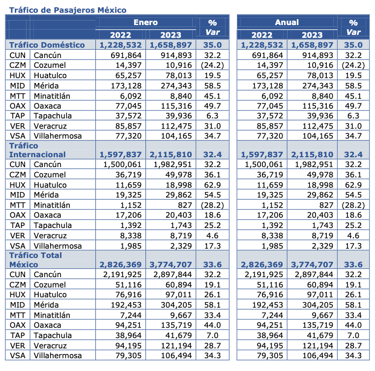 En cuanto a su total como grupo, incluidas sus operaciones en México, Estados Unidos y Colombia, ASUR informó que el tráfico total de pasajeros para enero de 2023 alcanzó un total de 6.3 millones de pasajeros, representando un incremento del 29.8 por ciento respecto a enero de 2022.