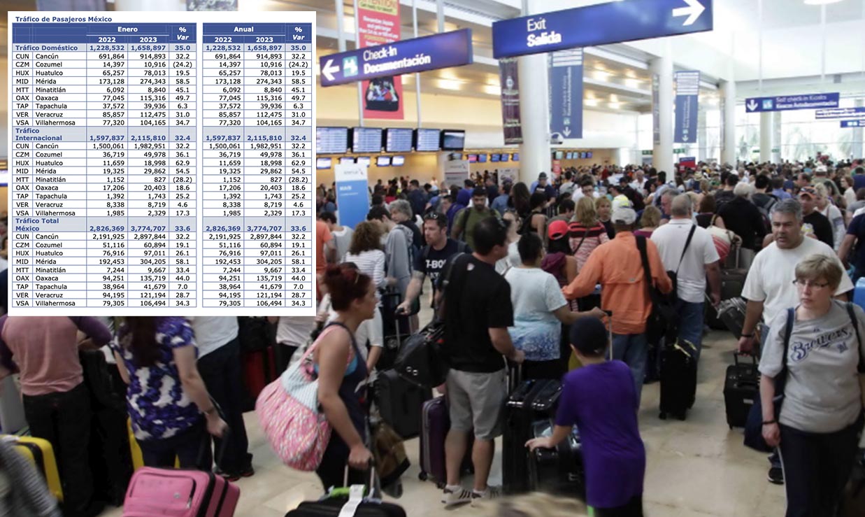 En cuanto a su total como grupo, incluidas sus operaciones en México, Estados Unidos y Colombia, ASUR informó que el tráfico total de pasajeros para enero de 2023 alcanzó un total de 6.3 millones de pasajeros, representando un incremento del 29.8 por ciento respecto a enero de 2022.