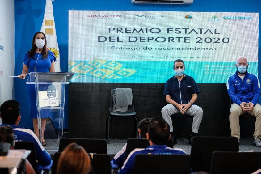 Autoridades reconocen a atletas quintanarroenses.- Autoridades estatales y municipales entregaron este jueves cinco reconocimientos del “Premio Estatal del Deporte 2020” a jóvenes deportistas, entrenadores y promotores que fueron referentes en el impulso del desarrollo de diversas disciplinas deportivas en Quintana Roo durante este 2020.