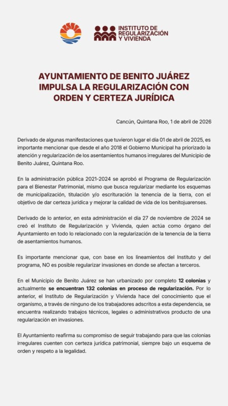 Cancún, Q. R., a 1 de abril de 2026.- Derivado de algunas manifestaciones por parte de vecinos de colonias no municipalizadas durante este miércoles, el Ayuntamiento de Benito Juárez reafirmó su compromiso con la atención y municipalización de los asentamientos humanos irregulares en el municipio, misma que ha sido un trabajo prioritario desde el 2018.