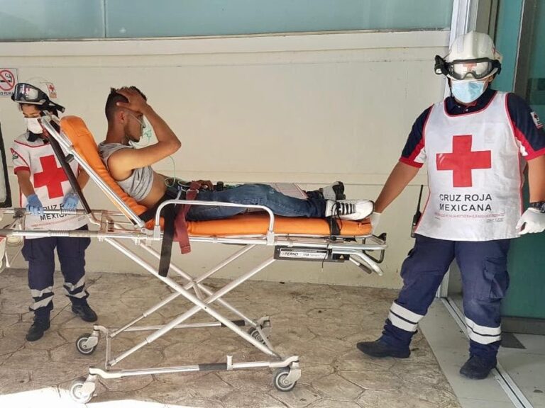 Por el estado en el que se encontraba, el sujeto tuvo que ser esposado a la batea de la patrulla hasta la llegada de los paramédicos de la Cruz Roja Mexicana, quienes le dieron los primeros auxilios para después trasladarlo de emergencia al Hospital General.