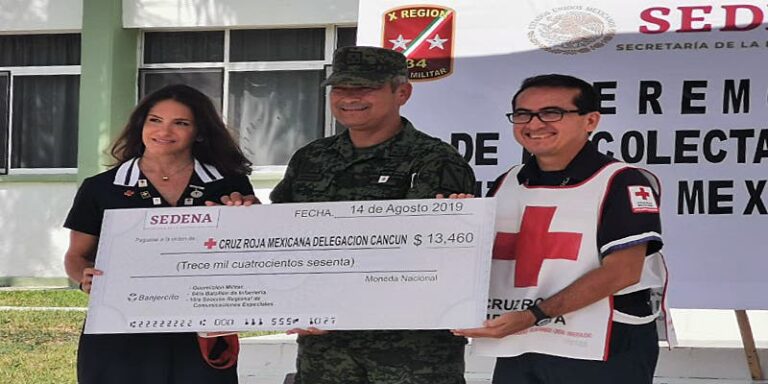 El 64 Batallón de Infantería entregó donativo de 13 mil 460 pesos a la Cruz Roja de Cancún. Amilcar Galaviz Aguilar, director general de la organización, delegación Cancún, refirió que este año se tuvo que ampliar el periodo de la colecta hasta el mes de mayo, pero sí lograron cumplir la meta proyectada de más de dos millones de pesos.