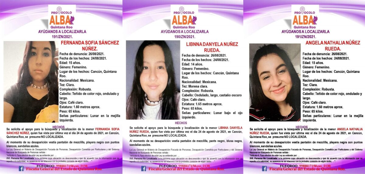 Activa la Fiscalía General del Estado (FGE) de Quintana Roo el protocolo ALBA para personas desaparecidas, por el caso de tres hermanas, menores de edad, quienes al parecer huyeron de su hogar resguardándose en casa de su abuela, según la versión de una de ellas por maltrato físico y psicológico por parte de su padrastro.