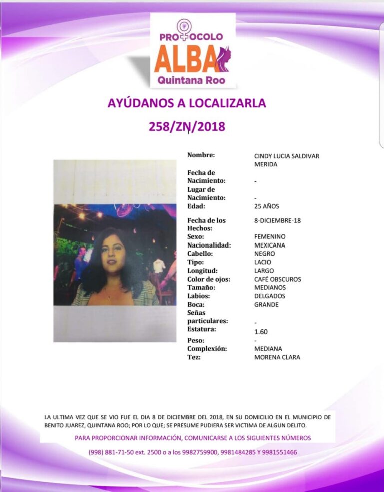 Tras el reporte de la desaparición de la joven la noche del sábado en Cancún, autoridades del municipio de Benito Juárez emitieron el protocolo Alba, con el número 258/ZN/2018, en el cual se encuentra información detallada de la desaparecida.