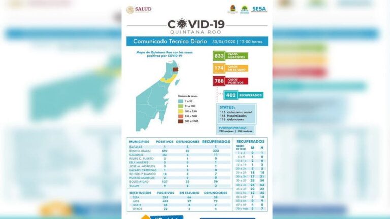 Por municipios los casos se distribuyen de la siguiente manera; Benito Juárez con 597 positivos, 80 defunciones y 323 recuperados; Solidaridad con 127 positivos, 22 defunciones y 56 recuperados; en Cozumel 23 contagiados, 6 defunciones y 11 recuperados.
